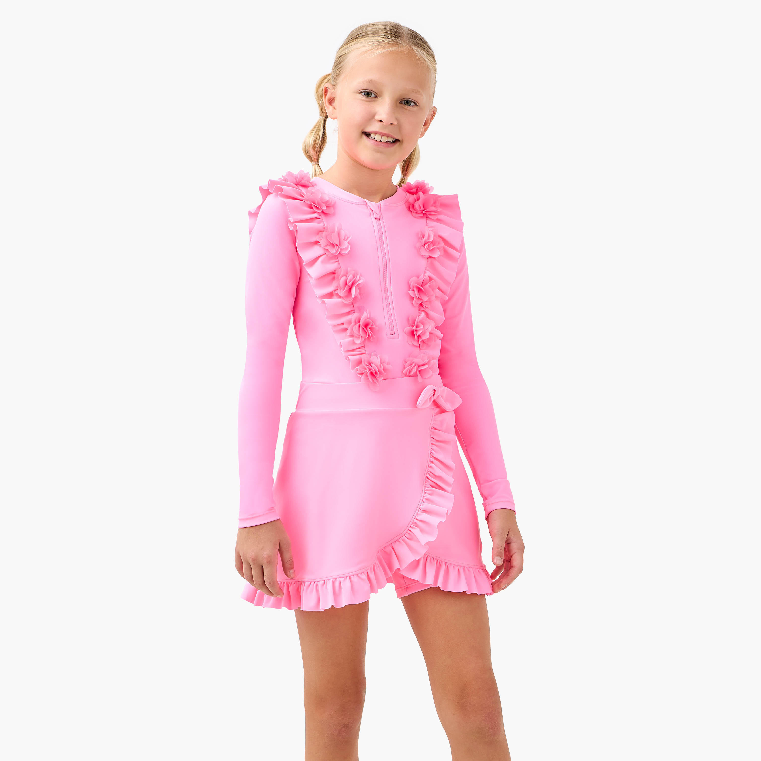 امنحي فتاتك إطلالة جذابة على المسبح مع طقم السباحة الرائعة هذا، يتألف من بدلة سباحة بكشكش مع تنورة ملفوفة أنيقة. مصنوع من خامات عالية الجودة وسريعة الجفاف، بسحاب إغلاق يضمن لها وبتفاصيل تعزز من جاذبيته عليها.