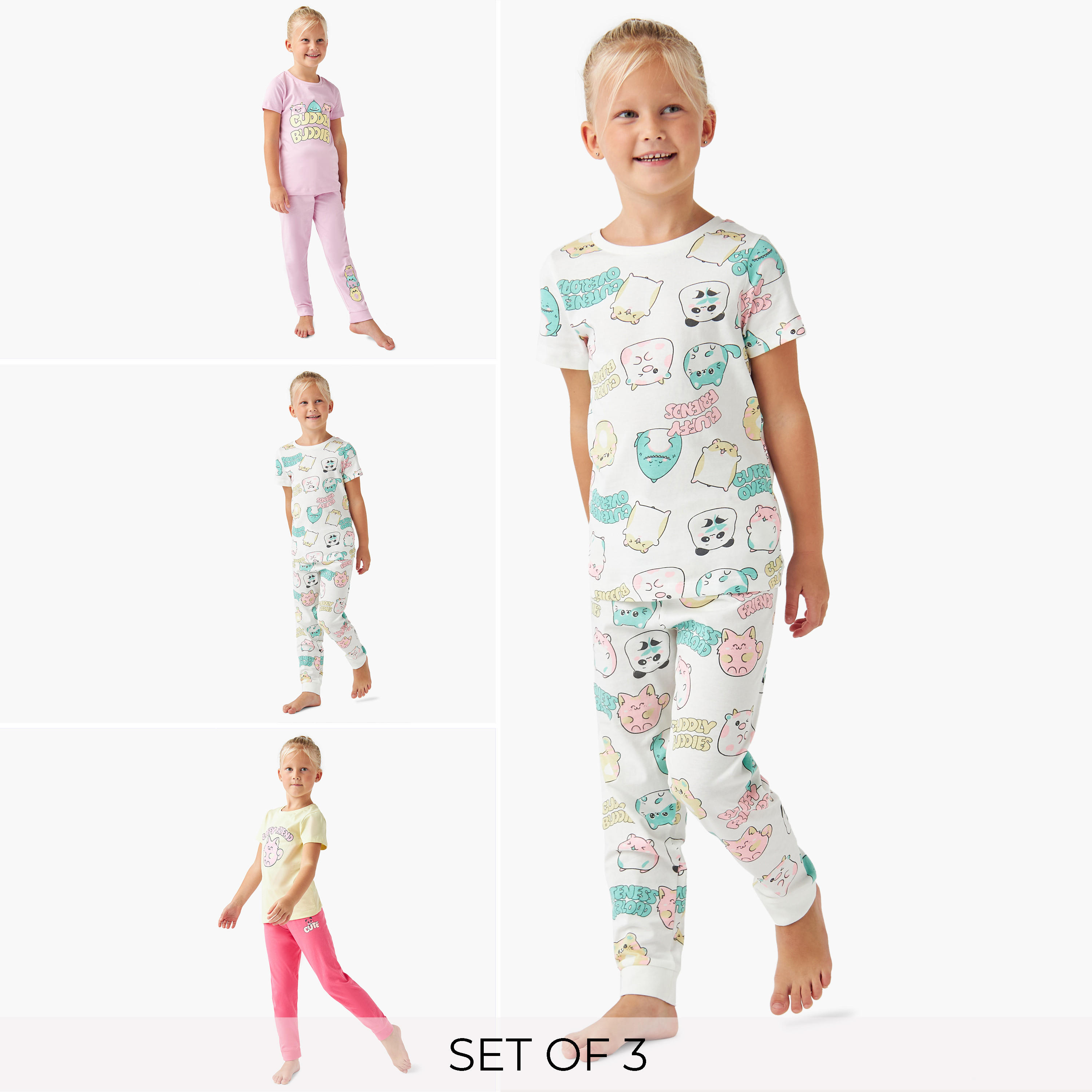اقتني لصغيرتكِ هذه المجموعة الرائعة لتضمني لها الراحة والأناقة، مكونة من 3 أطقم، وتتضمن تيشيرتات بأكمام قصيرة وبنطلونات بيجاما، بألوان زاهية وطبعات جذابة، كما أنها مصنوعة من خامة عالية الجودة ولطيفة على البشرة.