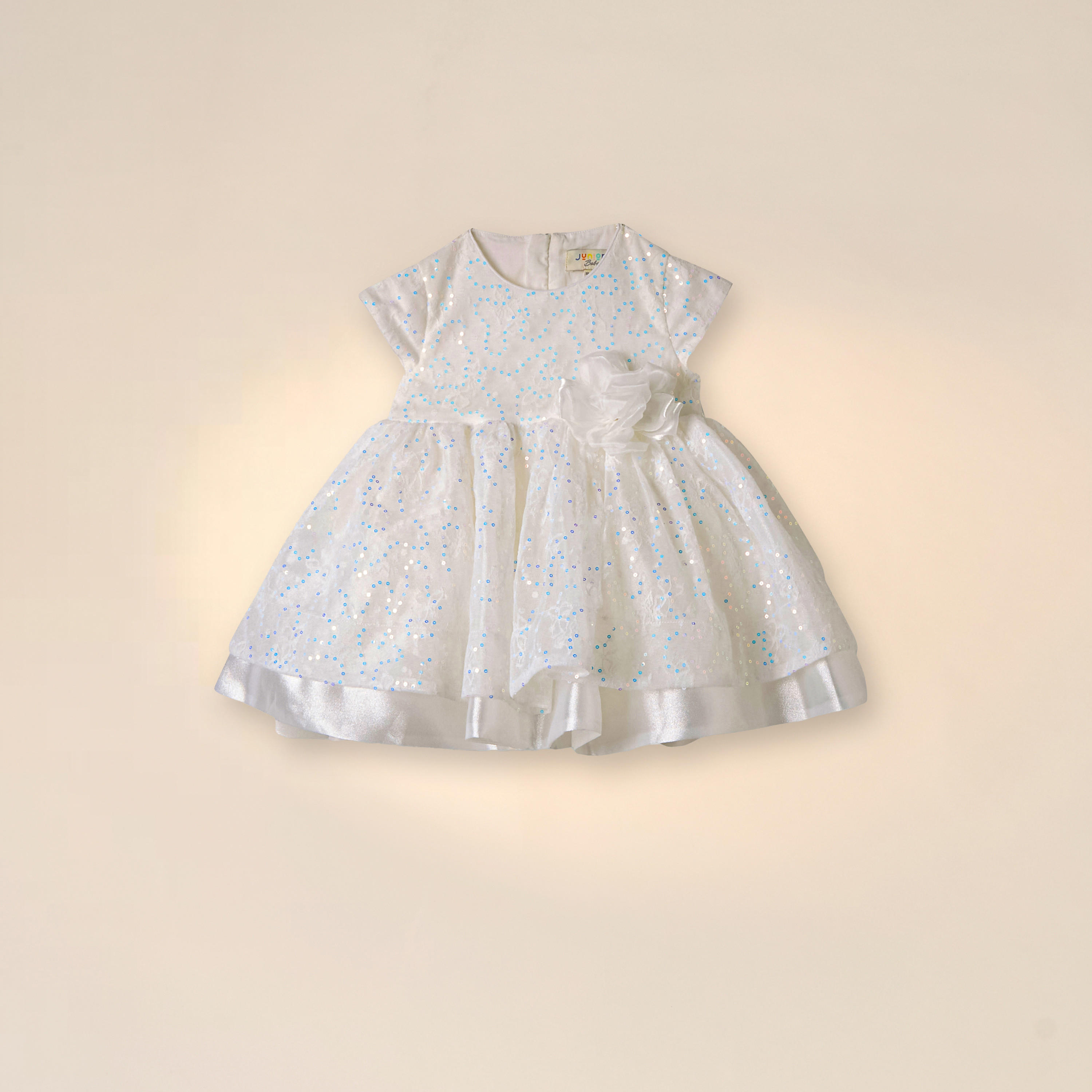 امنحي فتاتك إطلالة ساحرة باعتماد هذا الفستان الأنيق، مصنوع من خامات ناعمة ولطيفة على بشرتها الحساسة، بأكمام قصيرة وياقة مستديرة، ومزين بالترتر مع تفاصيل زهرة تضيف المزيد من الجاذبية إلى إطلالتها.