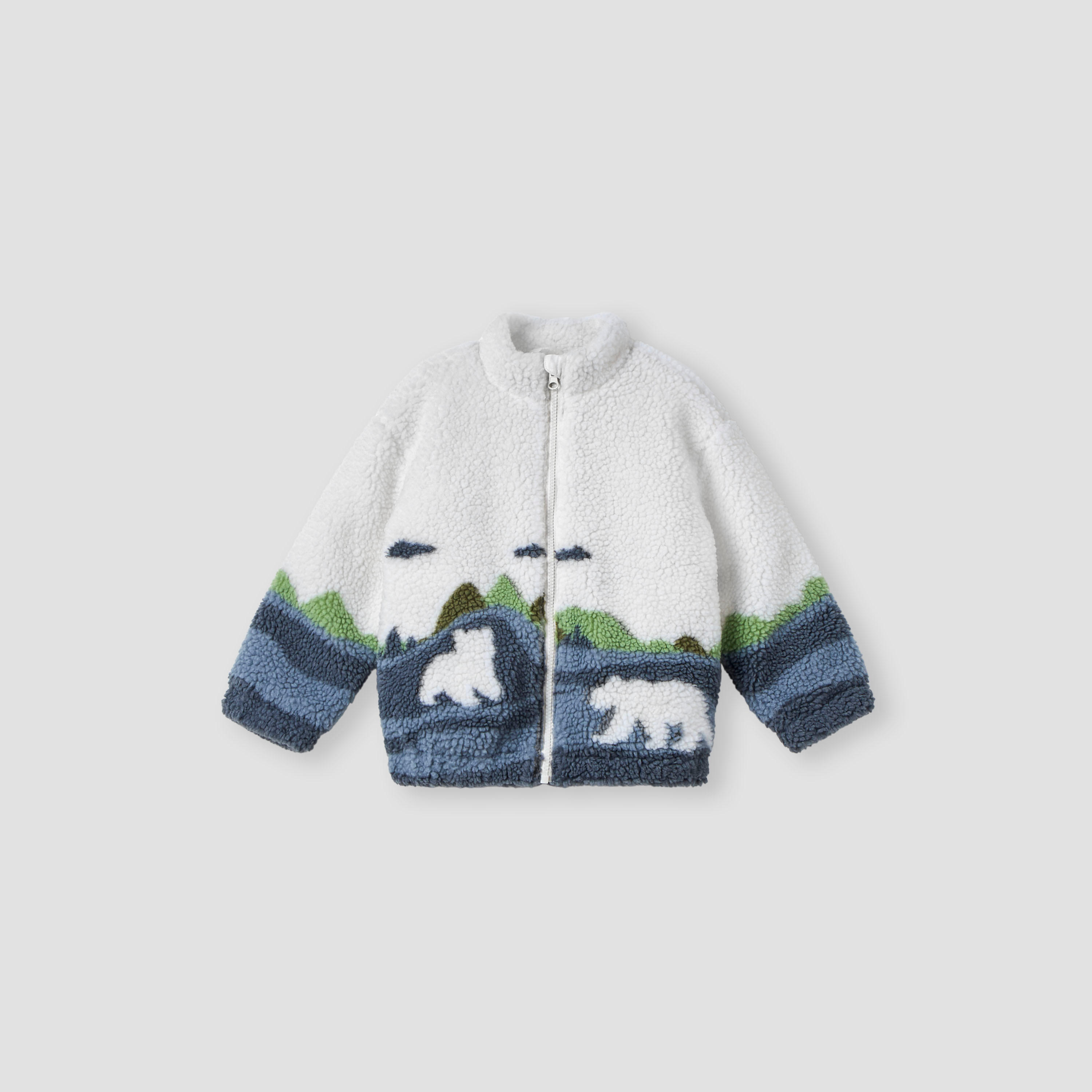 Dress your little adventurer in this plush jacket, perfect for chilly days. This cosy jacket features a charming polar bear and mountain design, adding a touch of arctic adventure to their wardrobe. The soft material ensures exceptional comfort and warmth, while the full-zip closure allows for easy layering. Pair this stylish high-neck jacket with their favourite trousers for a complete and comfortable outdoor look.