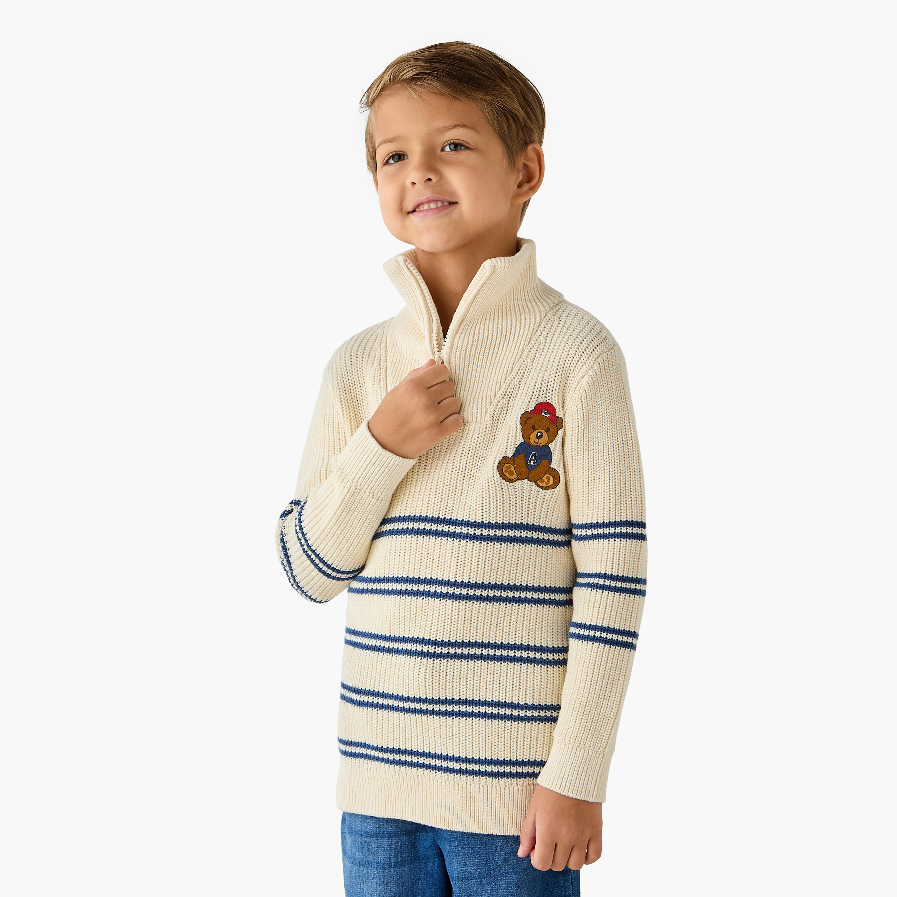 This charming sweater, crafted from soft fabric, features a playful bear appliqué and stylish navy stripes. The convenient quarter-zip closure allows for easy dressing and temperature regulation, making it ideal for layering. Pair this pullover with jeans or chinos for a complete casual look. This comfortable and fashionable pullover is perfect for everyday wear.