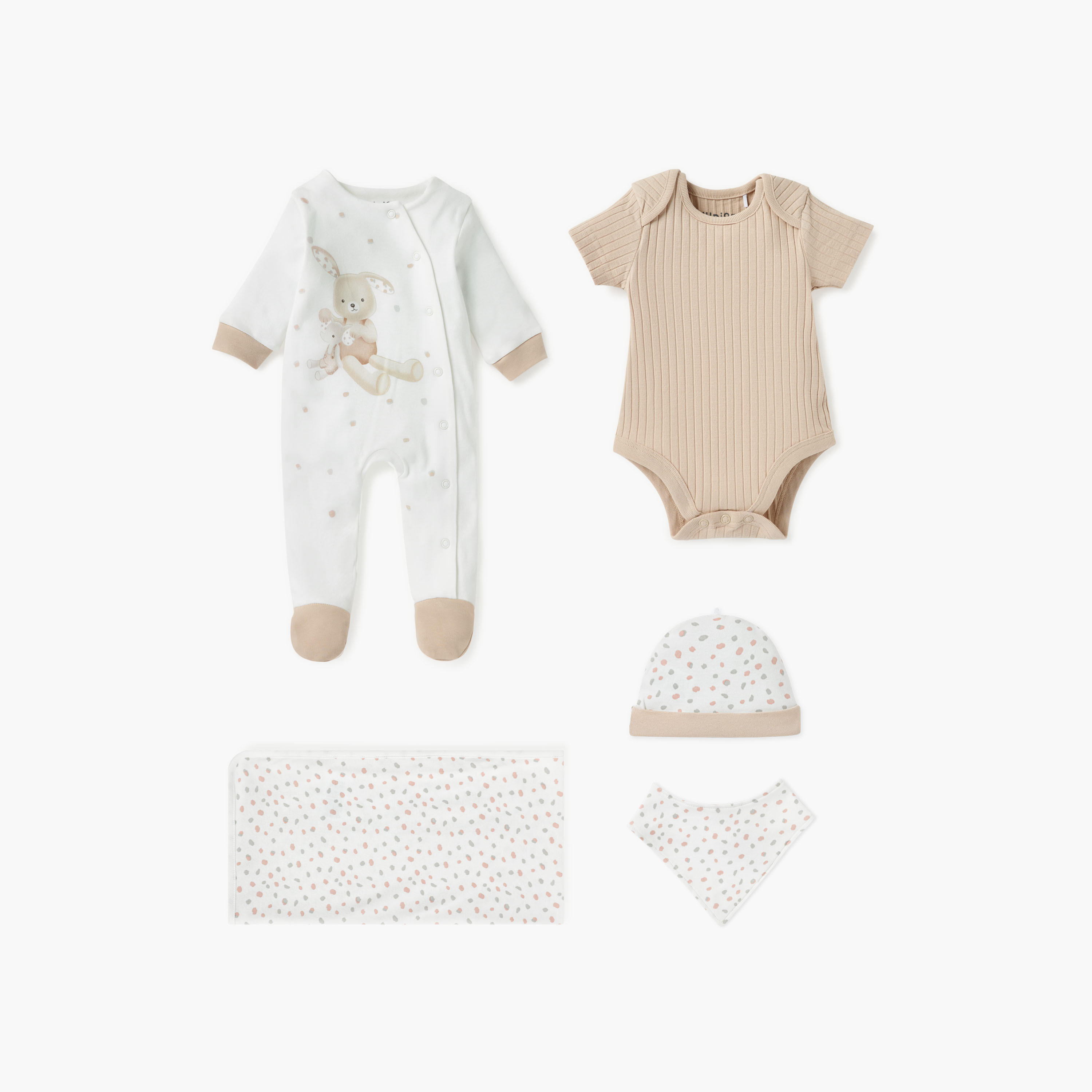 1 Sleepsuit, 1 Romper, 1 Cap, 1 Bib and 1 Receiving Blanket