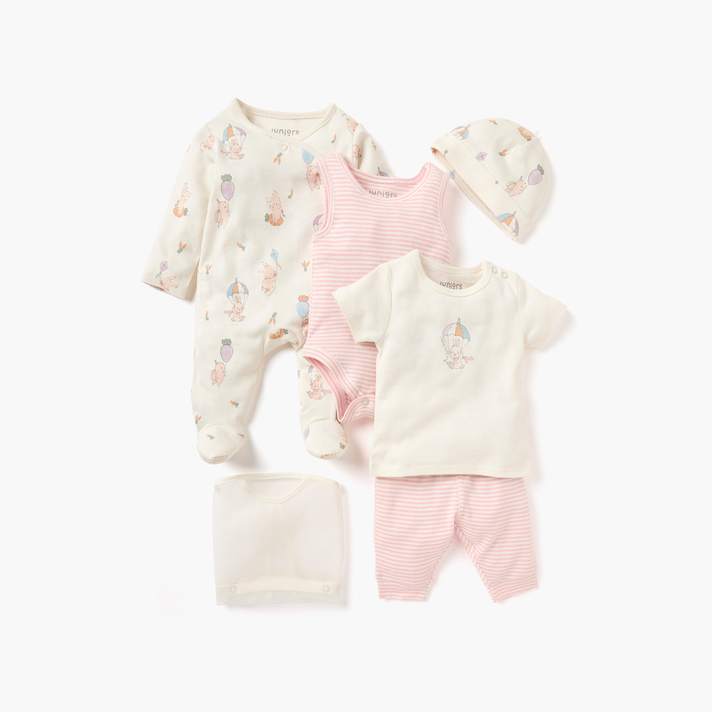 This printed six-piece clothing set for baby boys includes a sleepsuit, romper, T-shirt, shorts, cap, and cover, all crafted from soft, breathable cotton. Each piece is designed for comfort and style, ensuring your little one stays cozy and adorable throughout the day. Perfect for any occasion, this set makes a thoughtful gift for new parents.