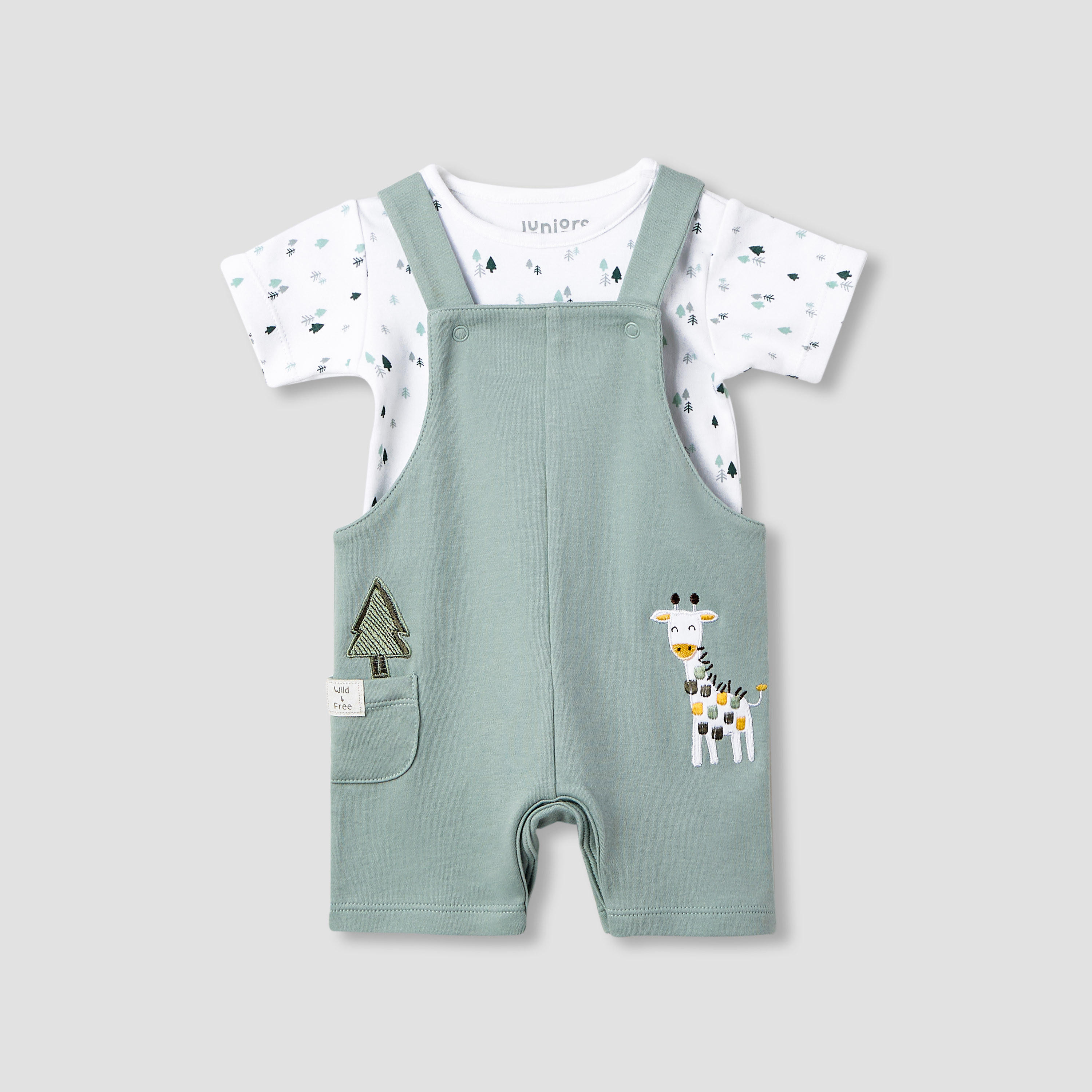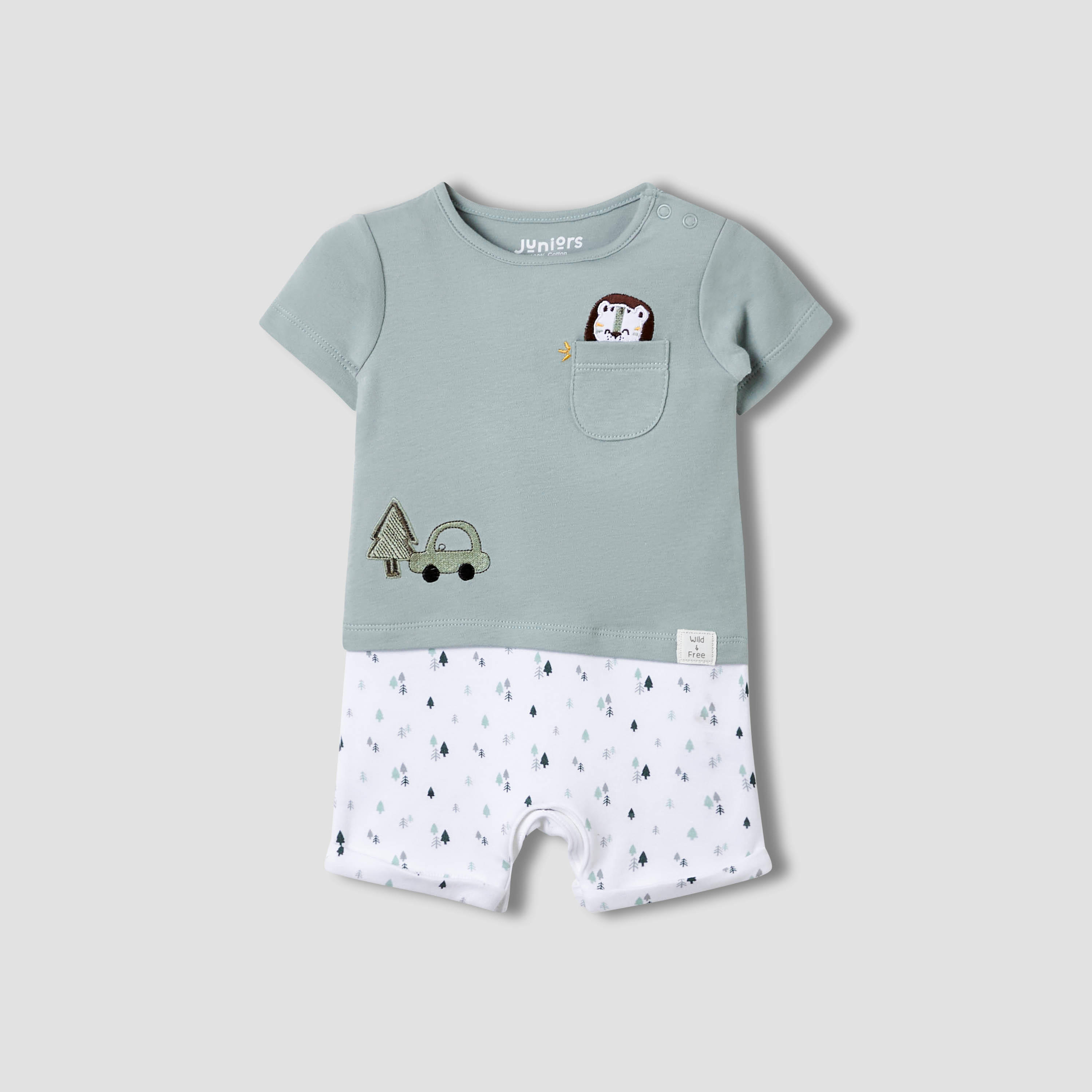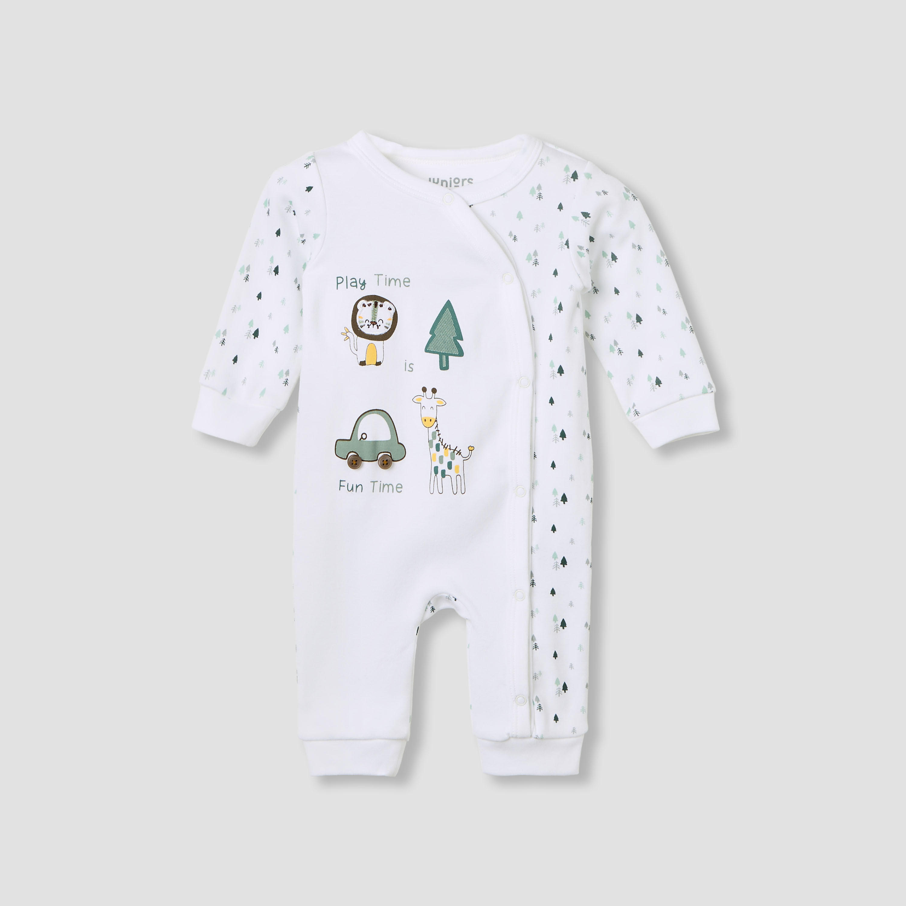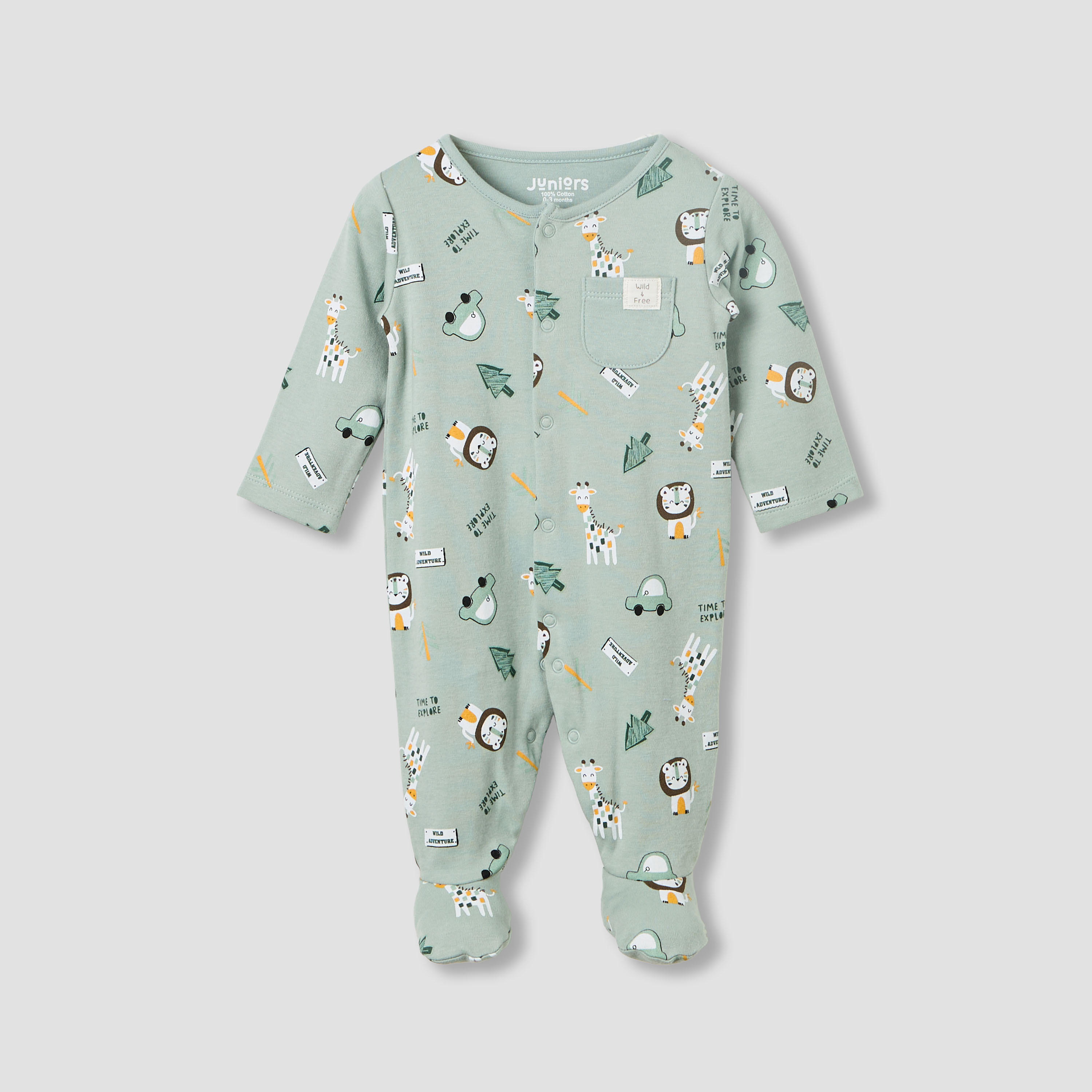 This charming cotton sleepsuit ensures optimal comfort for your little one throughout the day and night. The playful animal and tree print adds a delightful touch, making it perfect for everyday wear. Featuring a full-length design with integrated feet, this sleepsuit offers complete coverage and warmth. The convenient snap button closure facilitates easy changing, providing practicality for busy parents. This sleepsuit is an essential addition to any baby's wardrobe.