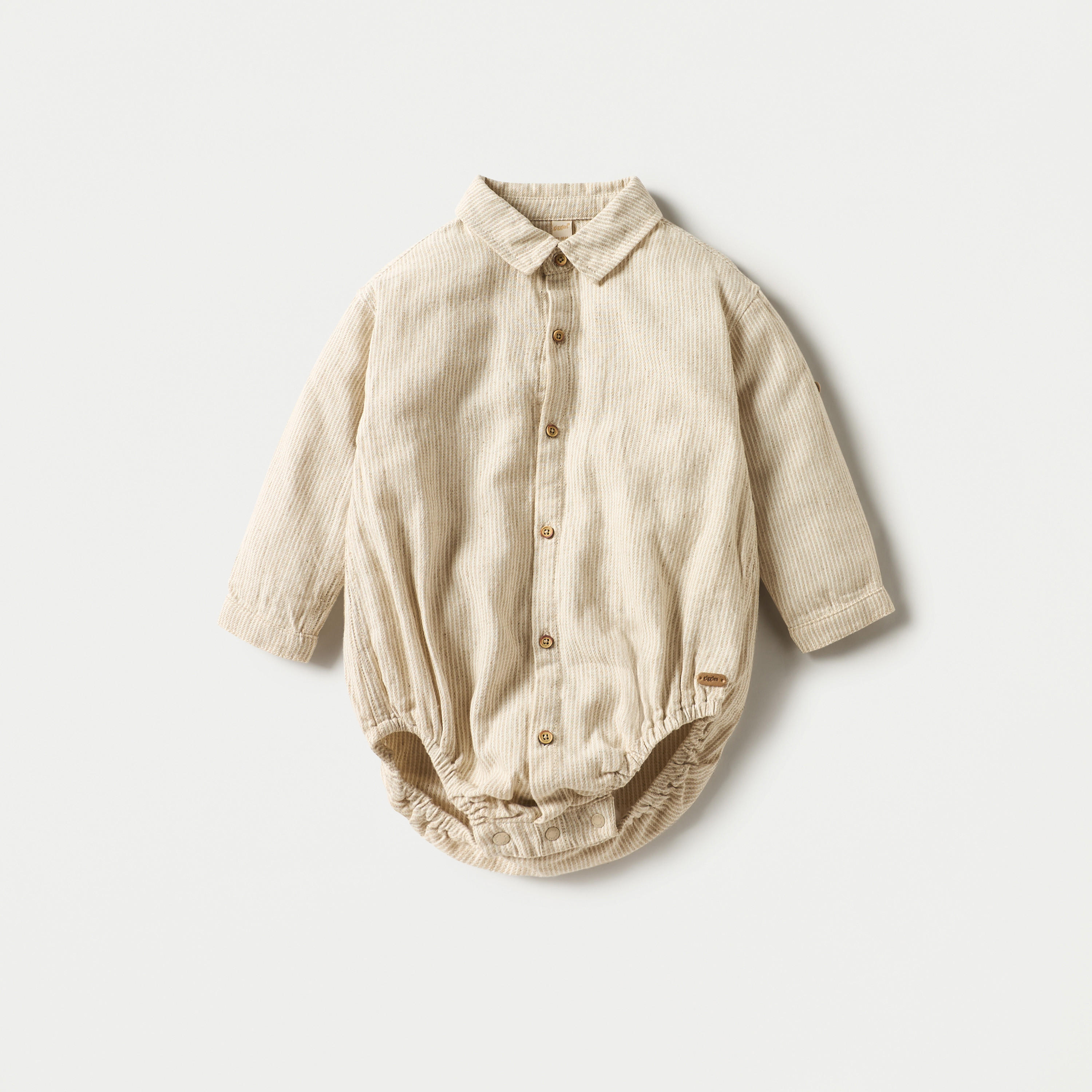 Featuring a classic collar and long sleeves, this bodysuit is designed to keep your baby cozy and stylish. The striped pattern adds a playful touch, while the soft fabric ensures gentle comfort against your baby's skin. Perfect for layering or wearing on its own, this bodysuit is a versatile addition to your baby's wardrobe.