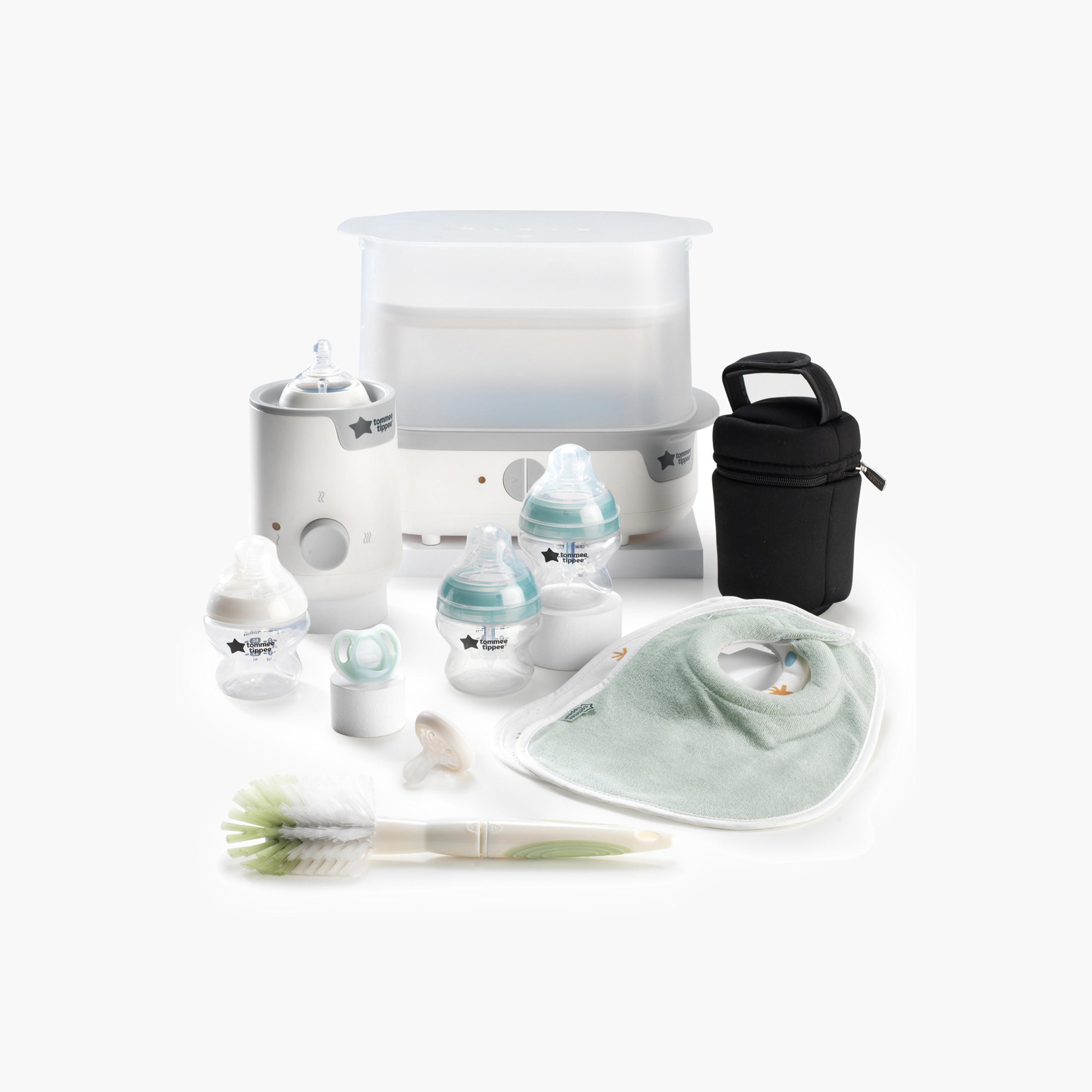 The Tommee Tippee Complete Feeding Set contains everything you need to make baby feeding straightforward. With our Super Steam Advanced Electric Bottle Steriliser can sterilise up to 6 baby bottles in just 5 minutes, killing viruses and 99.9% of bacteria. This baby bottle steriliser uses the 100% natural steam, so there are no chemicals or residue. The quick and easy way to ensure you always have feed-ready bottles for your baby.To help avoid nipple confusion, our most breast-like, easy latch-on teat has been designed with breastfeeding experts to mimic the natural flex, stretch and movement of a mum’s breast. The anti-colic valve helps to prevent the symptoms of colic by ensuring your little one ingests more milk and less air.Our insulated bottle bags are portable and convenient. Simply store sealed water in a bottle and add formula powder when your baby is ready for their bottle. The bags can be used to store both hot and cold bottles, so they are perfect for any weather.