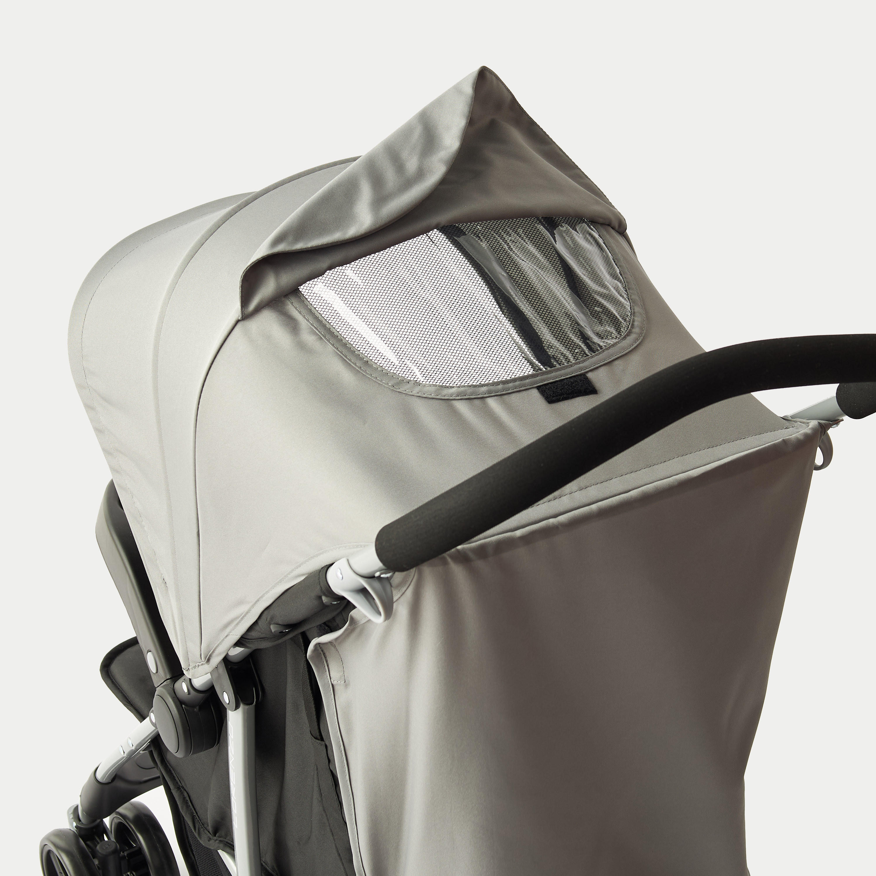 Front swivel wheels with rear linked breaks with large canopy and shopping basket