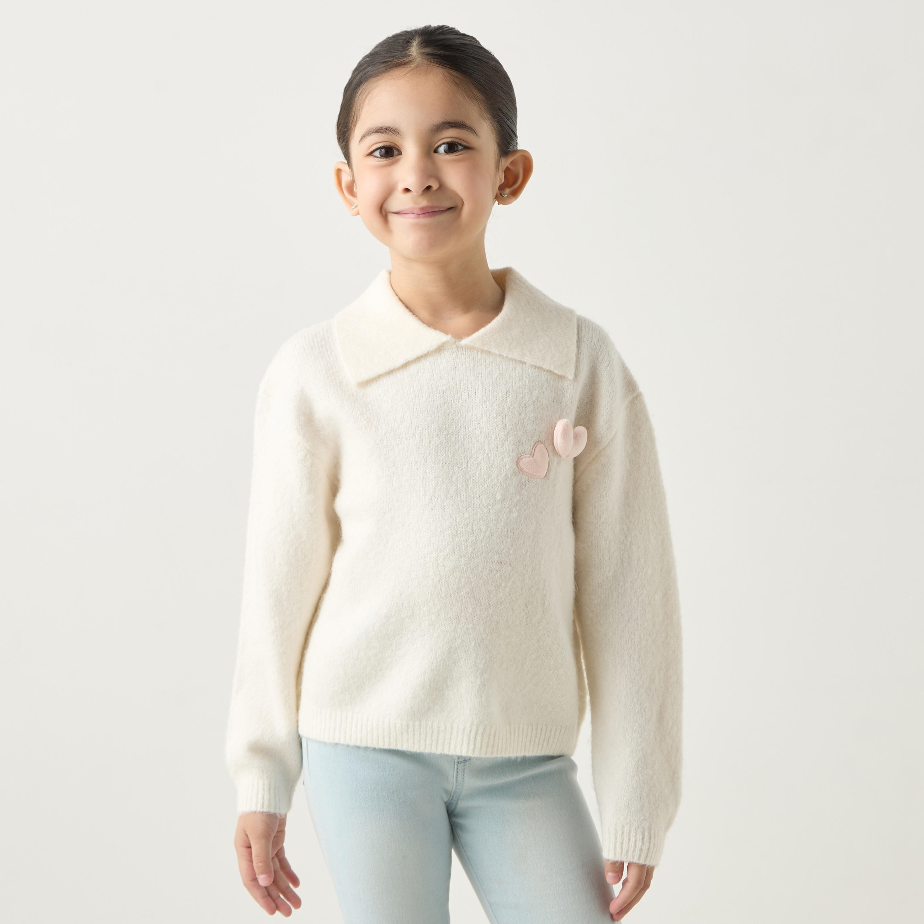 Juniors Heart Applique Sweater with Collared Neckline and Long Sleeves