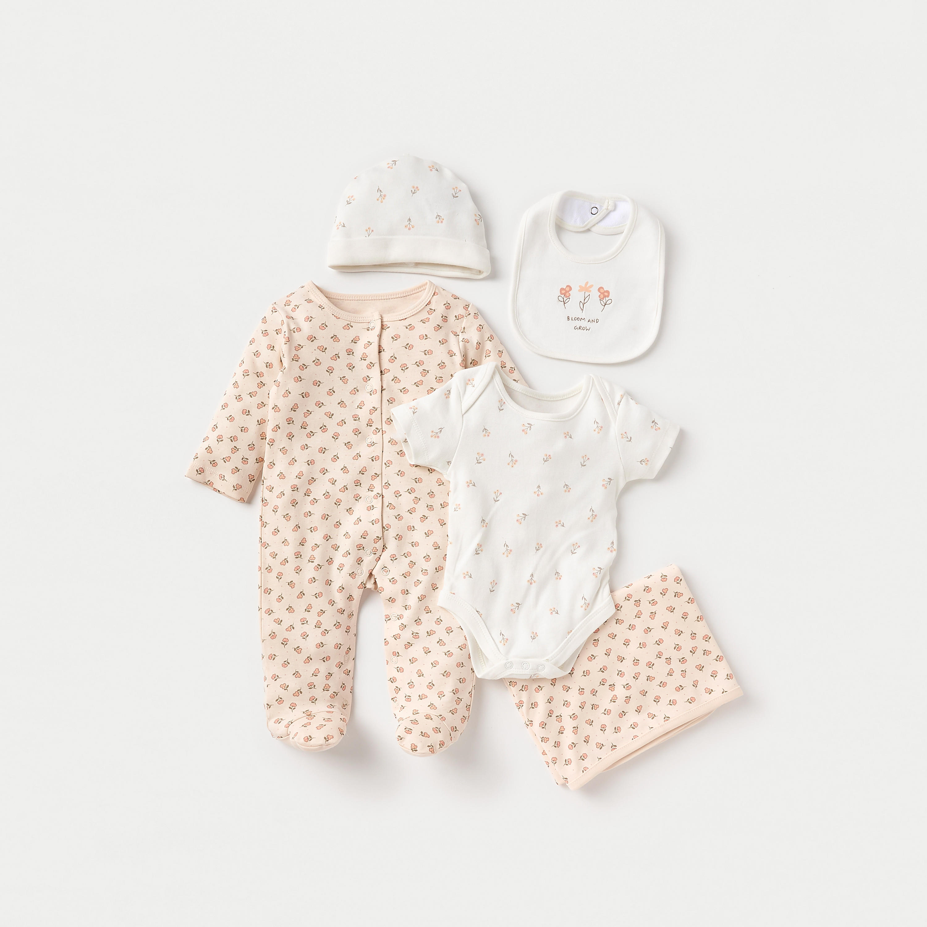 This charming clothing gift set is perfect for your little one's comfort and style. It includes a cosy sleepsuit, a soft bodysuit, a matching beanie cap, a bib, and a blanket, all featuring an adorable print. Crafted from gentle fabric, this set ensures baby's delicate skin remains comfortable throughout the day. Ideal for gifting, it embodies both practicality and delightful design.