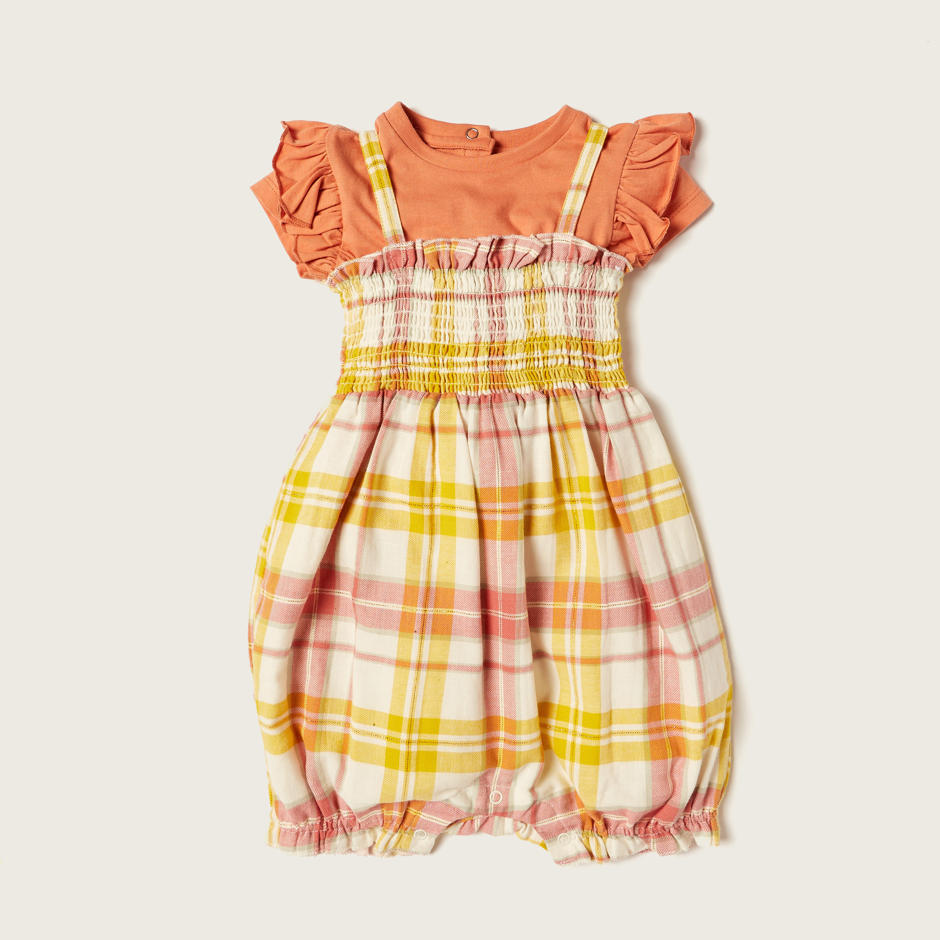 This is a two-piece dungaree set for your newborn. It includes a solid round neck T-shirt with short sleeves and a pair of checked dungarees with a smocked detail on the front. The contents of the set are crafted from a soft material that will keep your baby comfortable and relaxed all day long.
