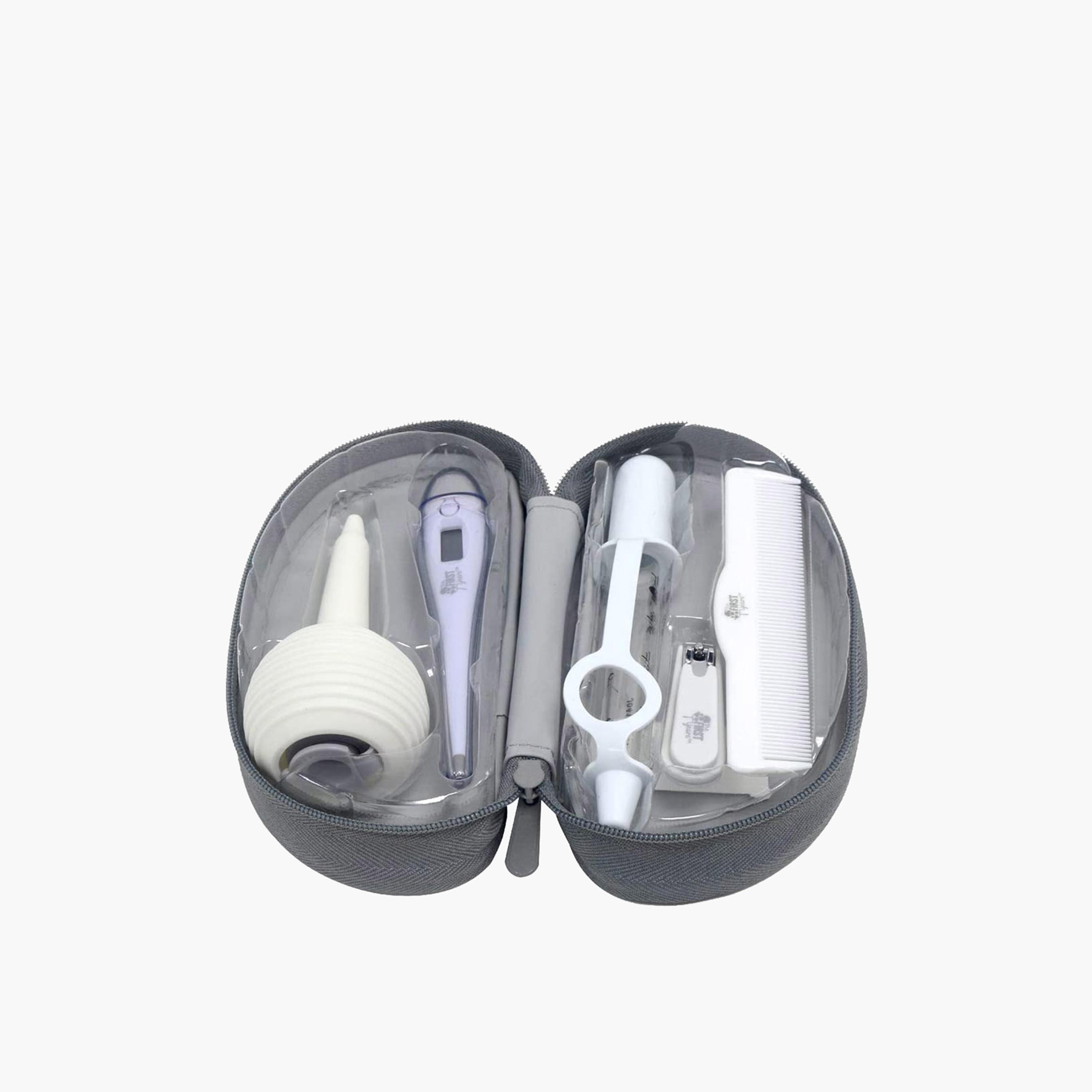 Includes deluxe travel storage bag, nasal aspirator, digital thermometer with case, medicine dropper with cap, medicine spoon with cap, nail clipper