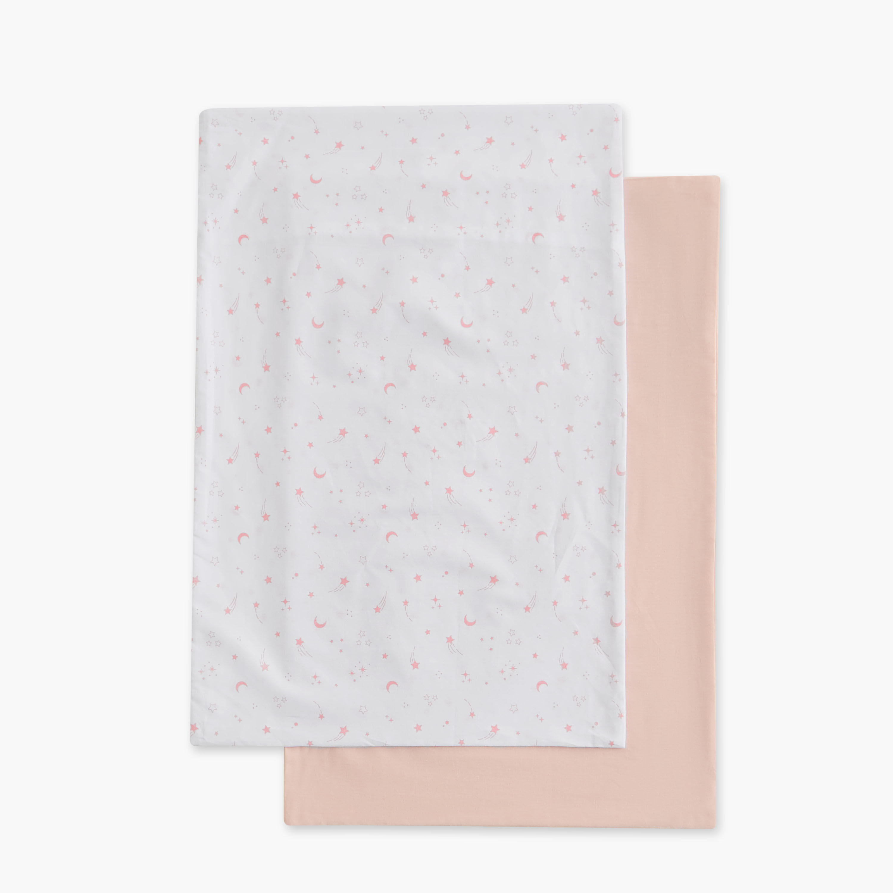 Ensure restful sleep for your little one with this set of two baby pillowcases. Crafted from soft, breathable material, these pillowcases offer gentle comfort against delicate skin. This set includes one plain pillowcase and one with a charming star and moon print, adding a touch of whimsy to the nursery. These pillowcases are easy to care for and maintain, ensuring long-lasting use. Pair these with coordinating cot sheets for a complete look.