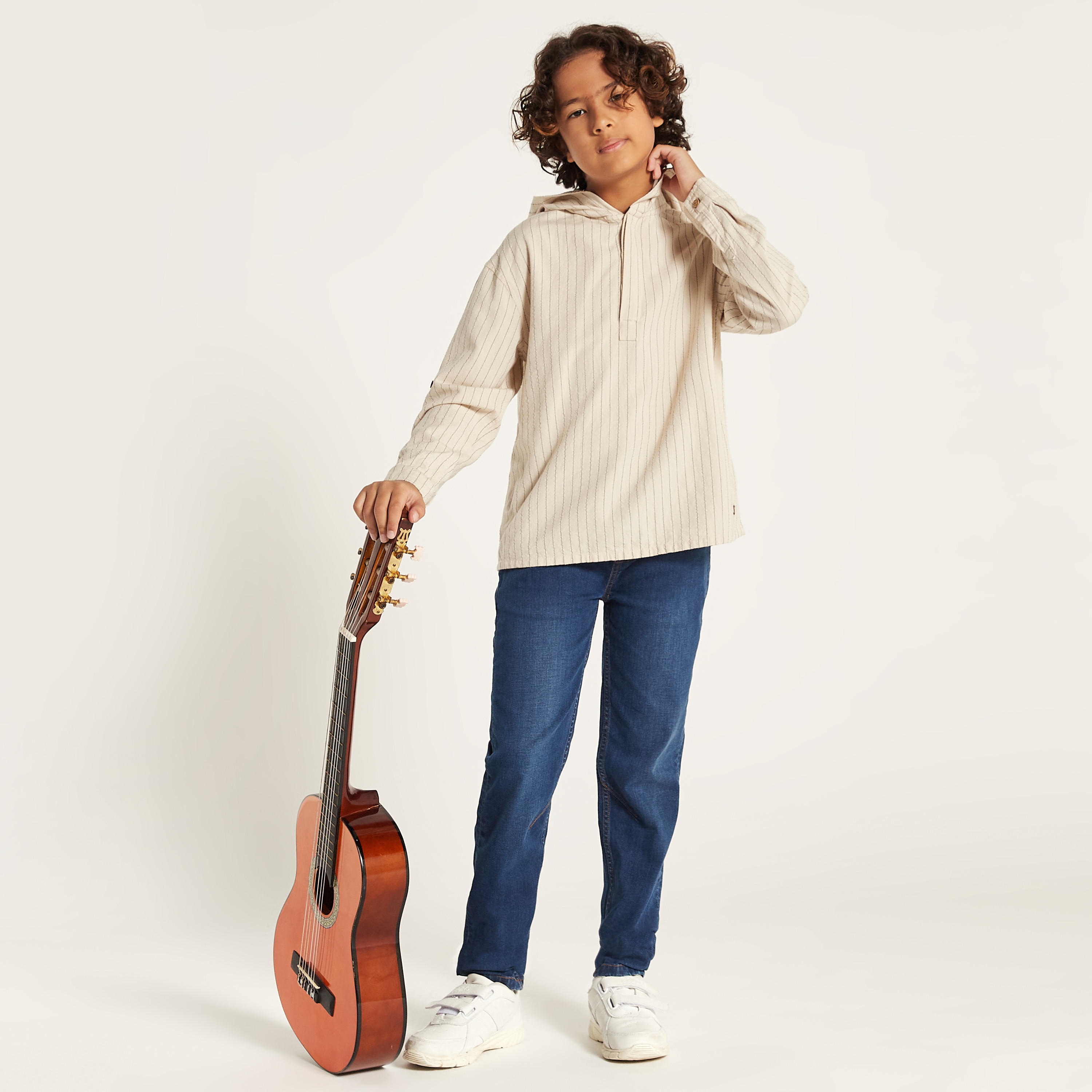 Choose this trendy shirt by Eligo for your young boy's casual collection. It is amped up by the hooded neck and stripes, while the long sleeves and concealed half-placket in front complete its look. Tailor-made from quality fabric, this shirt ensures prolonged hours of comfort.