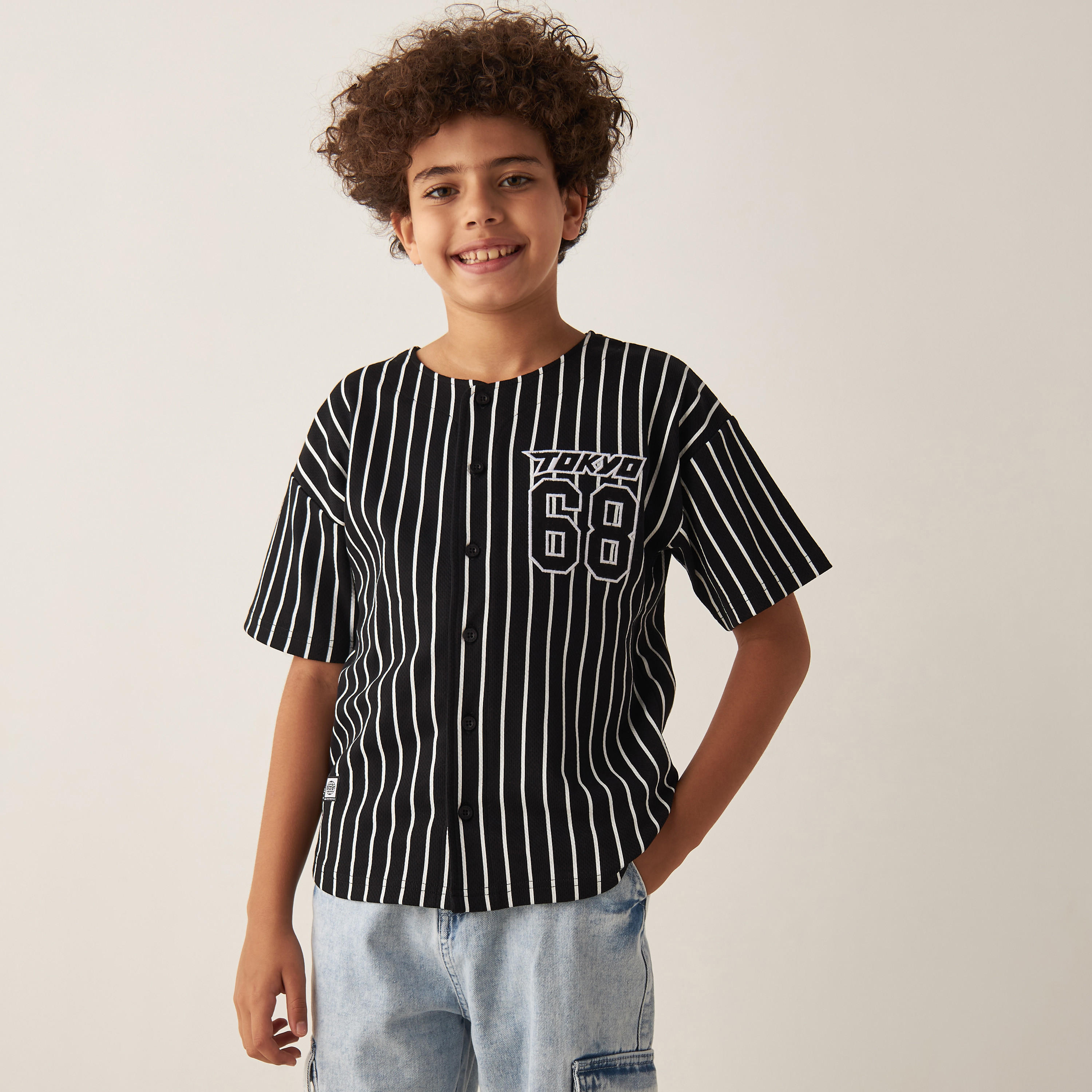 A striped shirt is a classic piece of clothing that can be dressed up or down. This shirt is made from cotton and features short sleeves and a crew neck.