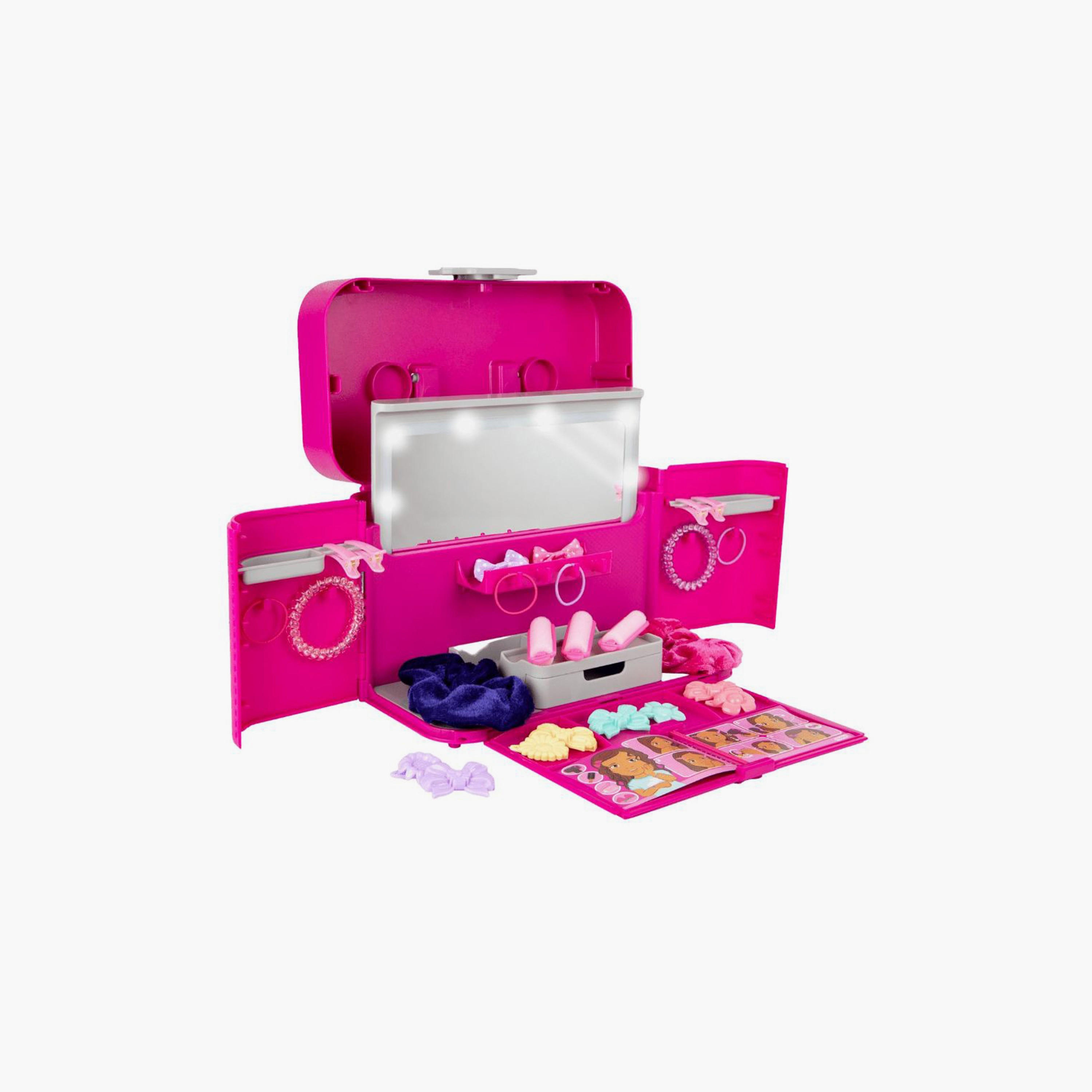 The Casdon Ultimate Realistic Play Styling Case is a foldable pink and silver styling set designed for budding stylists aged 3 and up. This compact case features a built-in mirror and double-sided styling cards, offering endless creative possibilities. With over 25 hair accessories included, your child can explore a variety of hairstyles. Compatible with other styling toys in the Dyson range, this set enhances imaginative play. Realistic features such as enticing lights, sounds, and blowing air mimic the experience of using real Dyson hair styling products. Requires 3 x AAA batteries (not included).