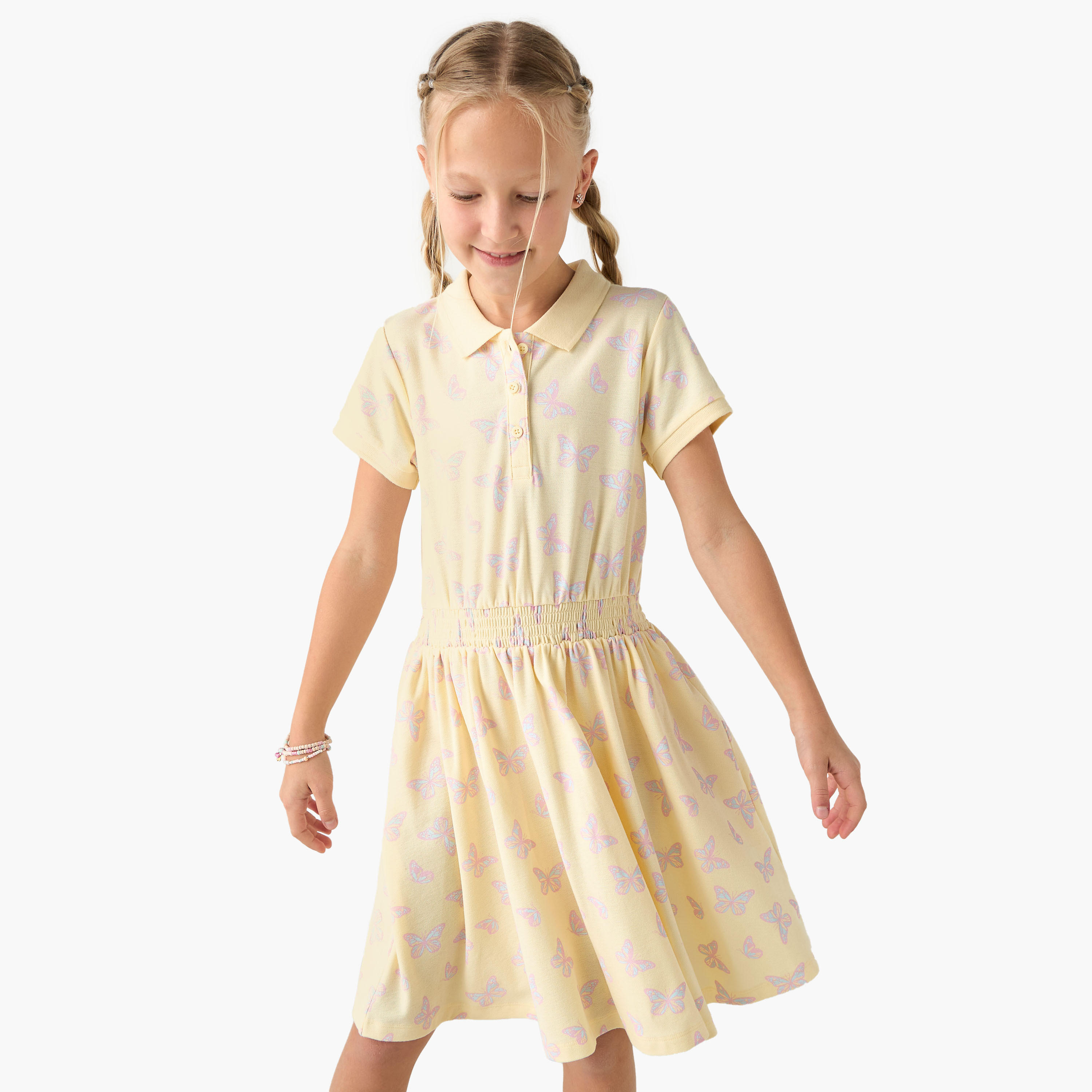 Juniors Butterfly Print Polo Collar Dress with Short Sleeves and Smocked Detail