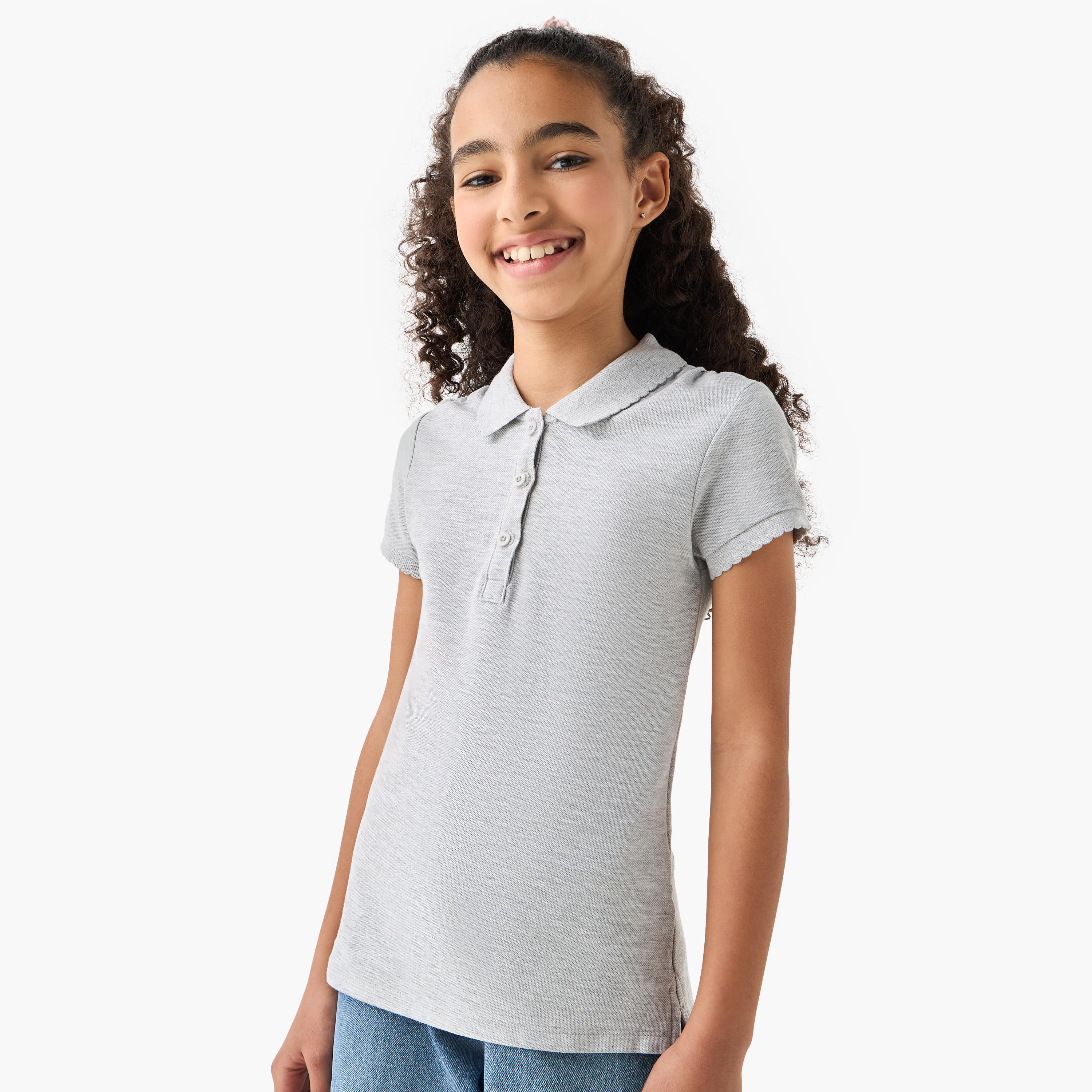 Add more essentials to your kid's closet with this polo neck T-shirt by Juniors. The solid colour and scalloped collar make it more appealing. Team the T-shirt with shorts and sandals for a casual look.
