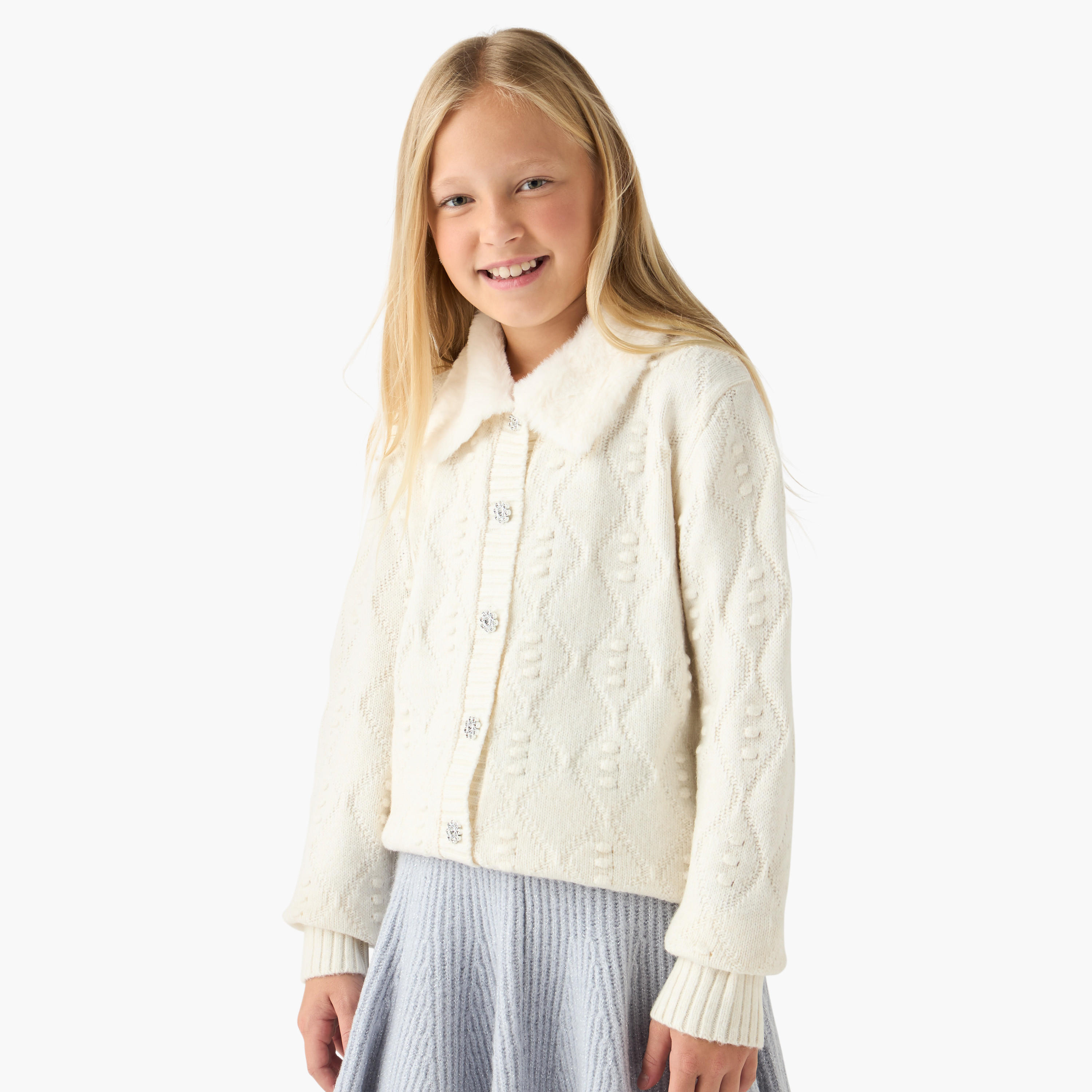 This charming cardigan, crafted from a soft knit, offers both warmth and a stylish appearance. The textured knit pattern provides visual interest, while the plush collar adds a touch of sophistication and extra comfort. This cardigan is a versatile layering piece, perfect for cooler weather, ensuring your child remains cosy and fashionable. Pair this elegant cardigan with a dress or skirt for a refined ensemble.