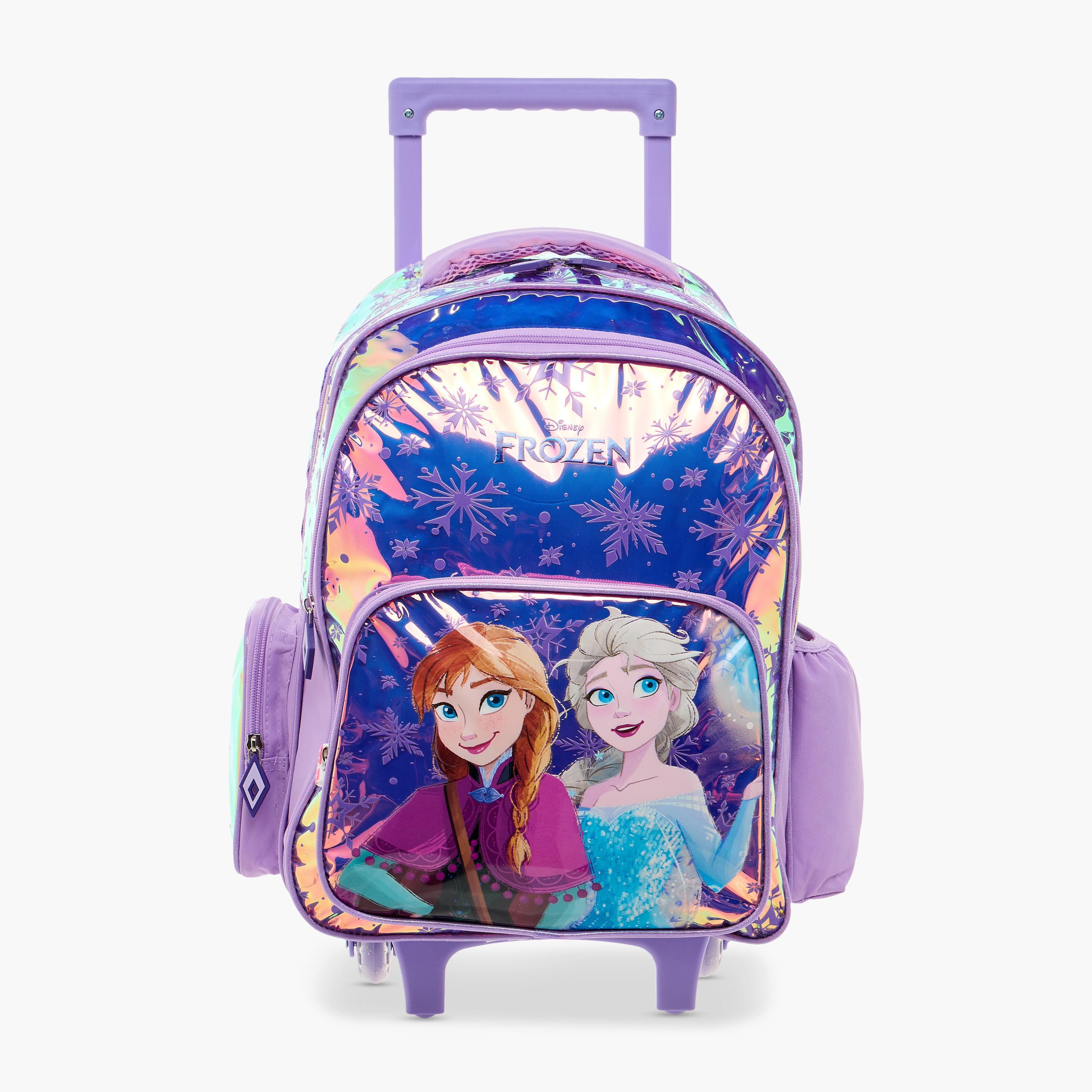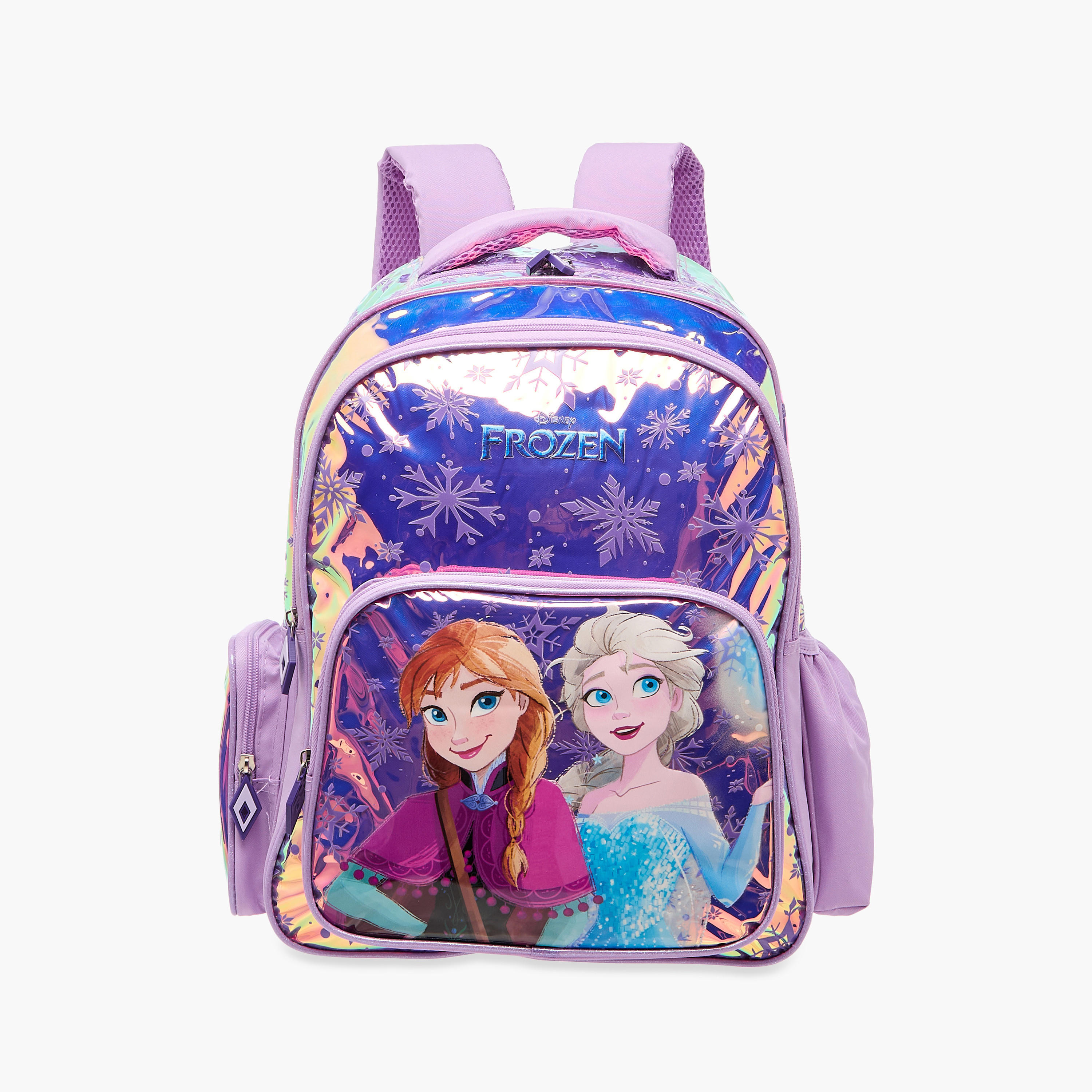 • The iridescent design, featuring Anna and Elsa, adds a touch of magic to school days.