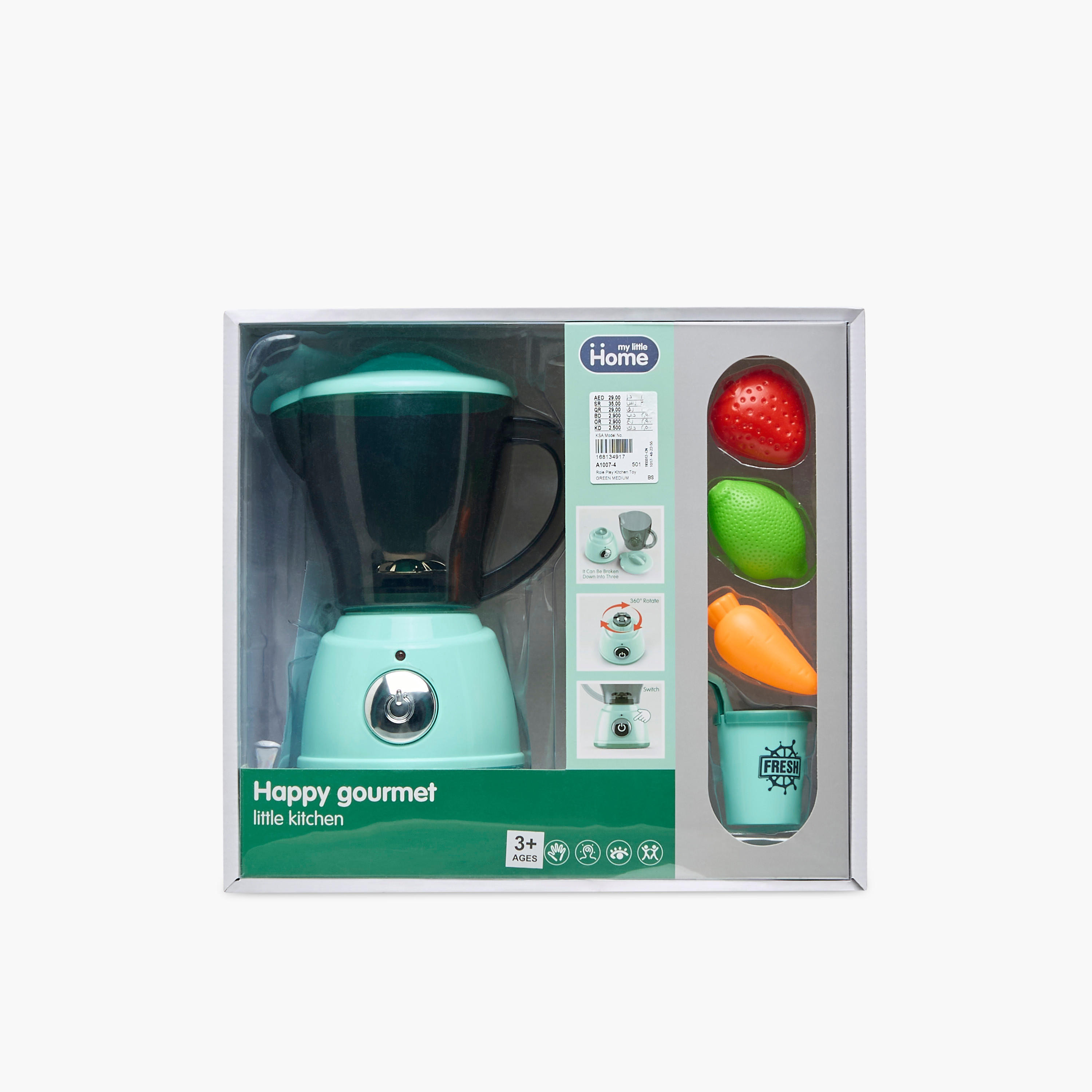 Introduce young children to the joy of cooking with this playset. This engaging kitchen toy features a functional blender that rotates three hundred and sixty degrees, along with assorted play fruits and a cup. Designed for imaginative play, this set encourages role-playing and helps develop fine motor skills. This delightful playset is ideal for aspiring young chefs, offering hours of creative fun and learning.
